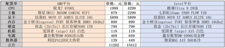 不过,AMD锐龙79700X不仅仅在游戏性能上有所领先,在实际装机当中的性价比优势也非常明显。这里也准备了AMD和Intel不同平台的两套配置单给大家参考: