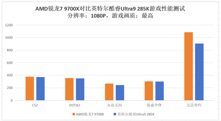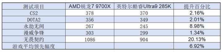 我们后续也针对5款主流网络游戏开展了测试,从结果来看,AMD锐龙79700X的表现颇为出色。在《无畏契约》这款游戏中,其帧数达到了1086FPS,相较英特尔酷睿Ultra9285K的904FPS,领先幅度高达20.13%;其余四款游戏(《CS2》《DOTA2》《永劫无间》《漫威争锋》)里,AMD锐龙79700X也均有不同幅度的帧数领先,整体5款游戏的平均游戏帧数领先幅度达到了6.92%。