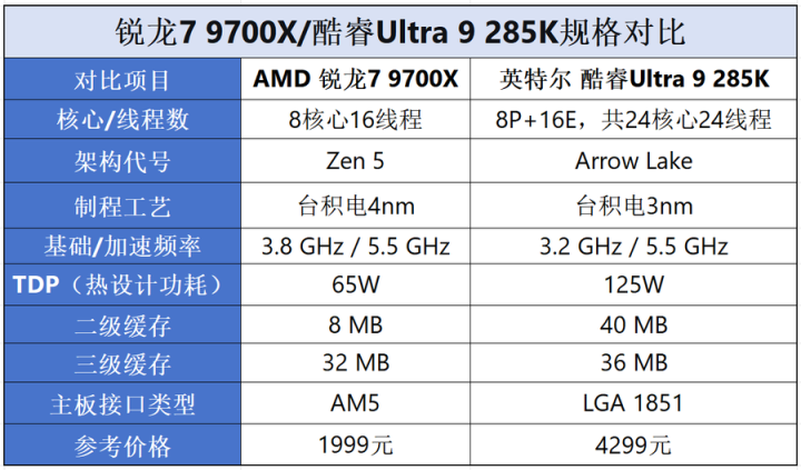 其实两款处理器的规格对比并没有想象的差距巨大。核心数量方面,AMD锐龙79700X采用纯大核的8核心16线程设计,其实在大核的数量上是和Ultra9285K一致的,搭配5.5GHz最高主频和32MB大三级缓存,在游戏等场景下显然也是有一战之力的,应对日常的办公、生产力和内容创作上实际上也是毫无压力。