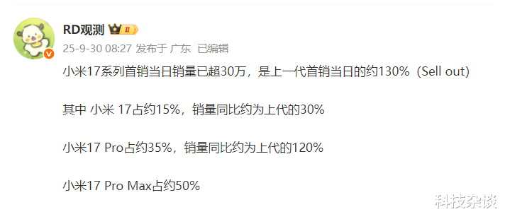 现实中小米17系列用真实的数据给了所有质疑者一个响亮的耳光,9月30日行业人士“RD观测”就给出了小米17系列首销日的数据。根据他提供的数据小米17系列首销当日整体销量已经超过30万台,是一代首销当日的130%。其中小米17占比约15%,是小米16首销日的30%,小米17 Pro占比约35%,是小米15 Pro的120%,小米17 Pro Max占比约50%,由于上代没有这个机型,所以没有对比数据。看到了吗?整体销量还是提升的,比上一代首销日好太多。特别是小米17 Pro系列简直可以用逆天来形容。